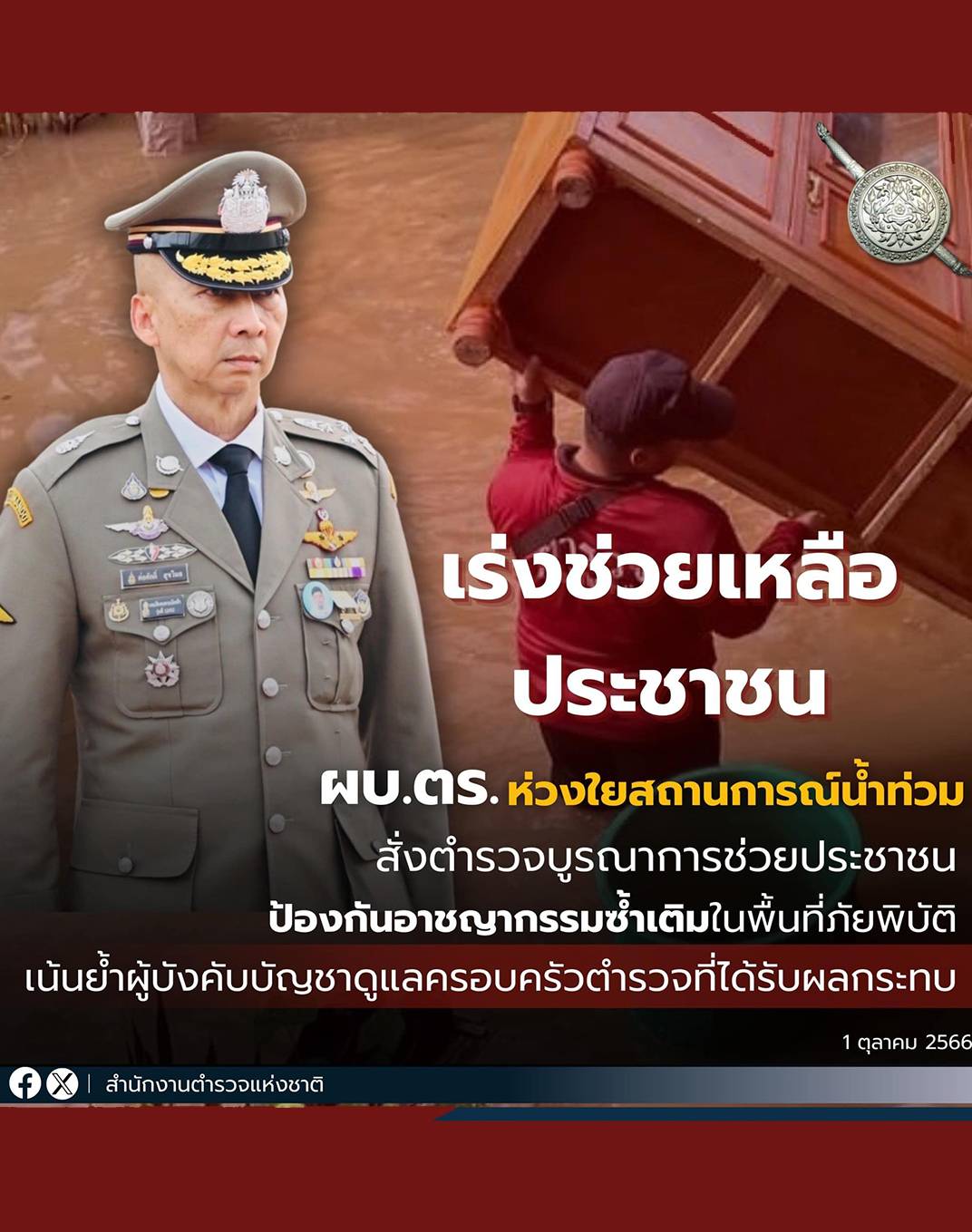 ผบ.ตร.สนองนโยบายนายกรัฐมนตรี ห่วงใยสถานการณ์น้ำท่วม สั่งตำรวจทุกหน่วยเร่งบูรณาการให้ความช่วยเหลือประ